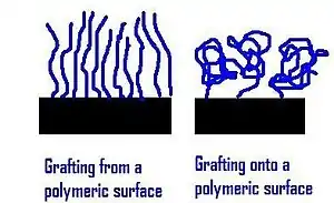Grafting, in the context of polymer chemistry, refers to the addition of polymer chains onto a surface. In the so-called 'grafting onto' mechanism, a polymer chain adsorbs onto a surface out of solution. In the more extensive 'grafting from' mechanism, a polymer chain is initiated and propagated at the surface. Because pre-polymerized chains used in the 'grafting onto' method have a thermodynamically favored conformation in solution (an equilibrium hydrodynamic volume), their adsorption density is self-limiting. The radius of gyration of the polymer therefore is the limiting factor in the number of polymer chains that can reach the surface and adhere. The 'grafting from' technique circumvents this phenomenon and allows for greater grafting densities.