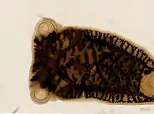 P. integerrimum is a leaf-like flatworm that can grow to a maximum length of about 3 cm (1.2 in). At the anterior (head) end are the mouth and a pair of suckers, and at the posterior end is the main device by which the parasite attaches to its host, the opisthaptor, with its three pairs of suckers, a pair of hooked anchors and marginal hooks.[2] The flatworm's mouth is connected to a muscular pharynx, an oesophagus and a gut, but it has no anus.[1]