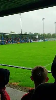 The ground is fully floodlit with a capacity of approximately 1,200 spectators and comprises hard standing area around the perimeter of the pitch. One stand behind the goals has a terrace with cover. The main stand holds the seating provision, with the seats obtained from Manchester City's old Maine Road ground when it was demolished.