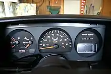 The Grand Am included Strato bucket seats upholstered in Naugahyde vinyl or corduroy cloth featuring manual recliners and adjustable lumbar supports - both features common on European-style sports/luxury sedans, but unusual for American cars of that time. Also included were an instrument panel from the Pontiac Grand Prix featuring a Rally gauge cluster with fuel, oil, water and volt gauges (a tachometer or fuel economy gauge was optional, and on cars so equipped, the clock was moved to a space on the lower instrument panel under the radio), three-spoke padded steering wheel with brushed-stainless spokes, and Genuine Crossfire African Mahogany trim on the dash facing, radio and clock surrounds, as well as the center console between the front seats.[11][12] Grand Ams also were among the first U.S.-built cars with a turn-signal mounted headlight dimmer switch that had been common on imported cars for decades.[13] Other standard equipment included concealed windshield wipers, a 1.12 in (28 mm) front stabilizer bar, and an in-the-windshield radio antenna.[3] Upscale options included air conditioning, tinted glass, power windows-locks-seat, rear defogger, various sound systems, and tilt-steering-wheel. AM/FM stereo with a tape player was optional.[3] The listed retail price for the 2-door coupe was US$4,264 ($26,028 in 2021 dollars [14]), listing it above the Firebird Trans Am.[3]