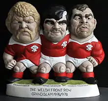 The club's strength during its glory days was its forwards, particularly the legendary Pontypool Front Row celebrated in song by Max Boyce.[14] The Pontypool Front Row also known as the "Viet Gwent", (motto "We may go down; we may go up; but we never go back") was made up of Graham Price, Bobby Windsor and Charlie Faulkner and played as a unit 19 times for Wales, only finishing on the losing side four times. They also played as a unit for the British and Irish Lions in several midweek matches and the final test match against Fiji.