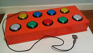 Unlike most of Konami's Bemani series, the Pop'n Music interface is not designed to represent any actual musical instrument. Instead, it uses nine buttons, each three-and-a-half-inches in diameter, laid out in two rows (since the location test of Wonderland, a multitouch panel is added). Five buttons are the bottom row, the other four being the top. Like in most Bemani games, color-coded notes (in this game called "Pop-kun" (ポップ君) and anthropomorphized with faces) fall from the top of the screen in nine columns that correspond to the buttons. When a note reaches the red line at the bottom of the screen, the player presses the button or tap the panel, which triggers a sound within the song.