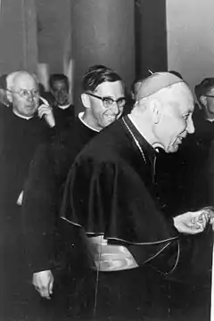 When war broke out, Maglione, Tardini, and Montini were the principal figures in the Secretariat of State of the Holy See.[32] Montini was in charge of taking care of the "ordinary affairs" of the Secretariat of State, which took much of the mornings of every working day. In the afternoon he moved to the third floor into the Office of the Private Secretary of the Pontiff. Pius XII did not have a personal secretary. As did several popes before him, he delegated the secretarial functions he needed to the Secretariat of State.[33] During the war years, thousands of letters from all parts of the world arrived at the desk of the pope, most of them asking for understanding, prayer, and help. Montini's task was to formulate the replies in the name of Pius XII, expressing his empathy, and understanding and providing help, where possible.[33]