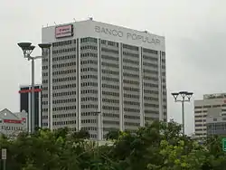 Popular's world headquarters are located in the San Juan's Hato Rey business district, on a stretch of a thoroughfare commonly known as Milla de Oro ("The Golden Mile") due to the number of banks headquartered in the area. Travelers who fly into the Luis Muñoz Marín International Airport can appreciate Popular's landmark building below.