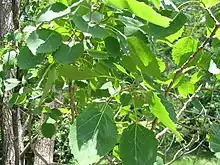 Populus grandidentata is a medium-sized deciduous tree native to North America, found mostly in the northeastern United States and southeastern Canada. Leaves are similar to Populus tremuloides, but slightly larger and having larger teeth.[3] The leaves tremble in the wind as P. tremuloides does. Bark of younger trees is olive-green, thin and smooth; after 30–40 years, the bark is gray, thick and rough with grooves.