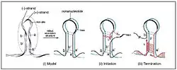 The two replicase enzymes that are created from ORF1, Rep and Rep', are conserved between the two types of PCV, and are part of the early phase of the virus. The replicases differ in that Rep is the full ORF1 transcript of 312 amino acids, whereas Rep' is a truncated form of ORF1 as a result of splicing and is only 168 amino acids in length. The promoter for rep (Prep) contains an Interferon-Stimulated Response Element (ISRE) that suggests Rep and Rep' are regulated by cytokine involvement,[6] and is probably a means for the virus to overcome the host's immune responses to infection. Rep and Rep' form a dimer that binds to two hexameric regions adjacent to the stem-loop, H1 and H2, which is required for replication. When the dimer binds to this region, the replicases cleave the loop region of the stem-loop and remain covalently bound to the H1 and H2 regions of the DNA, which becomes the 5' end of the DNA. The newly formed 3'OH end forms a primer using host RNA polymerase, which is then used by the host's DNA polymerase to begin transcription of the viral DNA via rolling circle replication. After the complementary DNA strand has been created, the stem region of the stem-loop forms a loose, non-hydrogen bonded, quadruplet DNA structure. This loosely associated structure can form short lived DNA-trimers which forms two templates for replication, as well as maintaining the nucleic integrity of the stem region of the stem-loop.[5] The termination of the replication sequence has not been identified, yet, though there is evidence supporting that Rep also represses its own promoter, Prep.