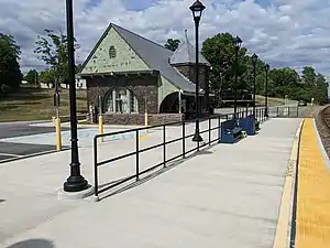 The station building, designed by architects Fuller & Wheeler, was built in 1888 by the Delaware and Hudson Railroad.[4] It was listed on the National Register of Historic Places on June 1, 1995 as the Delaware & Hudson Railroad Depot. The station building currently serves as a local senior citizen's and community center.[5] A Canadian Pacific Alco ore car and a Lake Champlain and Moriah Railroad caboose are on display near the station.