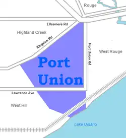 Port Union, also known as Centennial Scarborough is a neighbourhood in Toronto, Ontario, Canada. It is located in the south-east corner of Toronto, within the former suburb of Scarborough. The neighbourhood is bounded by Kingston Road to the north, Port Union Road to the east, the Lake Ontario shoreline to the south, and Highland Creek to the west.