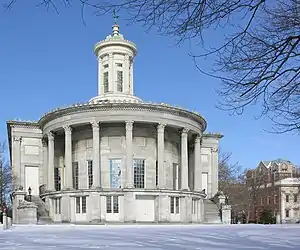 The Merchants' Exchange Building is a historic building located on the triangular site bounded by Dock Street, Third Street, and Walnut Street in the Old City neighborhood of Philadelphia. The building was designed by architect William Strickland, in the Greek Revival style, and built between 1832 and 1834. The exchange operated as a brokerage house in the nineteenth century, but by 1875 the Philadelphia Stock Exchange had taken its place. The building was declared a National Historic Landmark in 2001 due to its significance as the oldest extant stock exchange building in the country. Independence National Historical Park's headquarters are located in the building.