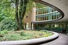 The Carnegie Classification of Institutions of Higher Education ranks Portland State as a university with "higher research activity."[6] The 1.4 million-volume, six-floor Branford Price Millar Library is located in the center of campus, opposite Fariborz Maseeh Hall on Park Avenue, and has several computer labs, technology and faculty reading rooms, and video viewing rooms. Built in 1966 as a rectangular structure, the library's convex wall of glass facing the campus' park blocks was added in 1989 to surround and preserve a large copper beech tree that was planted in 1890.