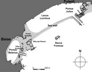 Agrippa knew that Lake Avernus was invisible from the surrounding sea and bay waters, and reasoned that the fleet's existence there could be kept secret from Sextus' navy until it was ready to strike. Agrippa's plan, executed from 37-36 BC,[2] was to dig a canal to connect Lake Avernus to Lucrinus Lacus (Lake Lucrino) and a second, shorter canal with a hidden entrance between Lake Lucrino and the sea.[3] A long road access tunnel, the Grotta di Cocceio, was also dug from Lake Avernus north to the town of Cumae.[4] The engineering challenges were enormous and the achievement momentous enough that both Virgil[5] and Pliny[6] mention the harbour as one of the man-made wonders of Italy.