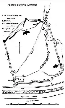 The first documentary mention of the site is found in the late 3rd-century Antonine Itinerary, where it is mentioned as lying 68,000 paces (68 Roman miles) from Londinium (London) and 16,000 paces from the cantonal capital Durovernum Cantiacorum (the modern Canterbury).[1] However, there is archaeological evidence of much earlier use as a naval base: tiles stamped CL BR have been found indicating that sailors or marines of the fleet, the Classis Britannica, were involved in its construction, as well as an inscription dated to the first third of the 2nd century (RIB 66) on an altar stone, dedicated to the god Neptune by a Lucius Aufidius Pantera, prefect of the Classis Britannica.[2] According to the 5th-century Notitia Dignitatum, the fort was garrisoned by a regiment raised in Tournai (numerus Turnacensium) and formed part of a defence system known as the Saxon Shore under the command of a Count.[3] The last mention of Lemanis in Latin sources is in the late 7th-century Ravenna Cosmography, by which time the site, along with the rest of Britain, had long been severed from the Roman Empire.[4]