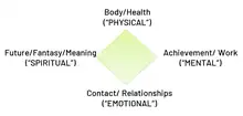 The Balance Model[33] is based on the concept that there are essentially four areas of life in which a human being lives and functions, and that significantly impact an individual's overall satisfaction, self-worth, and ability to cope with challenges. These areas serve as key indicators of an individual's personality in the present moment and encompass the biological-physical, rational-intellectual, socio-emotional, and imaginative, value-oriented aspects of daily life. While all individuals possess the potential for each of these areas, some may be more prominent or neglected based on variations in education and environment. Life energies, activities, and reactions are influenced by and connected to these four areas:
