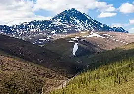 Poss Mountain is a prominent 6,180-foot (1,880 meter) mountain summit located in the Philip Smith Mountains of the Brooks Range, in the U.S. state of Alaska. The peak is situated 80 miles north of the Arctic Circle, five miles east of Dalton Highway, 11.3 mi (18 km) south of Sukakpak Mountain, and 190 mi (306 km) north-northwest of Fairbanks. The peak was named about 1930 by wilderness activist Robert Marshall after "Poss" Postlethwaite, an early and old gold prospector in this area around Wiseman.[3] Robert Marshall described the then 78-year-old Postlethwaite as "the oldest man in the Koyukuk," having spent 32 winters in the area.[4] The name was officially adopted in 1932 by the U.S. Board on Geographic Names. The Poss Mountain Research Natural Area (8,042 acres) was designated in 1991 to protect natural mineral licks and lambing habitat for Dall sheep. Precipitation runoff from the mountain drains into tributaries of the Middle and South Forks of Koyukuk River.