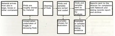 Post-excavation analysis constitutes processes that are used to study archaeological materials after an excavation is completed. Since the advent of "New Archaeology" in the 1960s, the use of scientific techniques in archaeology has grown in importance.[2] This trend is directly reflected in the increasing application of the scientific method to post-excavation analysis.[3] The first step in post-excavation analysis should be to determine what one is trying to find out and what techniques can be used to provide answers.[4] Techniques chosen will ultimately depend on what type of artifact(s) one wishes to study. This article outlines processes for analyzing different artifact classes and describes popular techniques used to analyze each class of artifact. Keep in mind that archaeologists frequently alter or add techniques in the process of analysis as observations can alter original research questions.[5]