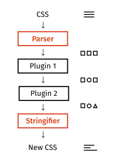 Features are made available through plugins. The plugins are small programs working with the object tree. After the core has transformed a CSS string into an object tree, the plugins analyze and change the tree. Then PostCSS generates a new CSS string for the plugin-changed tree.