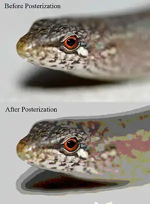 Posterization or posterisation of an image is the conversion of a continuous gradation of tone to several regions of fewer tones, causing abrupt changes from one tone to another. This was originally done with photographic processes to create posters. It can now be done photographically or with digital image processing, and may be deliberate or an unintended artifact of color quantization. Posterization if often the first step in vectorization (tracing) of an image.