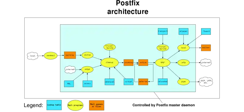- The clouds stand for points at which e-mails enter or leave Postfix. For example, smtpd receives mail from other mail servers or users whereas smtp relays mail to other MTAs.