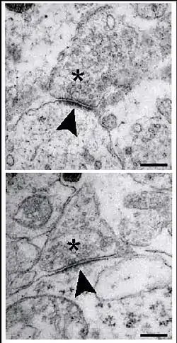 Ultra-structural analysis of synapses in the brainstem of wild-type (WT)mice at embryonic day 18.5. Synapses of WT neurons in the pre-Bötzinger-complex area exhibit presynaptic vesicles (asterisks), a synaptic cleft and a distinct postsynaptic density (arrowheads). Scale bar, 250 nm. From Heupel et al., 2008