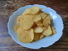 A potato chip (North American English and Australian English; often just chip) or crisp (British and Irish English) is a thin slice of potato that has been deep fried, baked, or air fried until crunchy. They are commonly served as a snack, side dish, or appetizer. The basic chips are cooked and salted; additional varieties are manufactured using various flavorings and ingredients including herbs, spices, cheeses, other natural flavors, artificial flavors, and additives.
