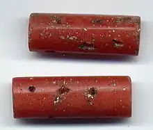 Another West African people known to produce powder glass beads are the Yoruba from Nigeria. Beads from their production differ technically from typical Ghanaian powder glass beads in that they are not made in molds and in the wet-core technique. Finely crushed glass is moistened with water and shaped by hand. The perforations are made before the beads are fired, using a pointed tool. So-called Ateyun beads were made in different shapes but always in red, to imitate real Mediterranean coral. Genuine coral was rare, but very much sought after and highly valued by the Yoruba people. Yoruba bead makers made their own imitations at more affordable prices.