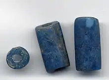 Apart from red beads imitating coral, blue beads were also highly valued. Keta awuazi beads, originating from Nigeria or possibly Togo, were made in horizontal molds and mold marks are often evident along their sides. Keta awuazi beads are cylindrical in shape. Manufacture ceased during the 1940s. Krobo bead makers produced similar blue powder glass beads, using glass derived from cold cream jars to achieve the blue colouration.