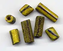 Meteyi beads were made by the Ashanti people of Ghana. Longitudinal seams that can often be observed on these beads give evidence that they were made in horizontal molds. Meteyi beads are often ellipsoid in cross section and they have a rough surface on the side which touched the bottom of the mold during firing. They can be opaque yellow, and more rarely, green, blue or white, with stripe decorations in combinations of blue, yellow, white or red. Manufacture ceased during the 1940s.