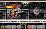 Controlling Redd Ace is done with the D-pad and attacking enemies is performed with either the A or B buttons, while the shooting angle can be adjusted by crouching down. A notable aspect of the game is that there are no dedicated buttons for jumping, instead, the action is executed by pressing up on the D-pad, while holding down on the same direction activates the rocket pack to fly above ground. Pressing Option 2 brings a menu screen that allows the player to check information about the bomb components as well as details on the multiple weapons acquired that can also selected with Option 1, however when pressing the button in front of a computer terminal, the menu instead display a map of the current location players are in and information on enemies, among other elements. There is no password or saving feature, so the game must be completed in one session and once all lives are lost, the game is over.[2]