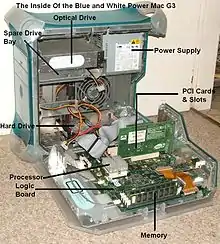 Though still based on the PowerPC G3 architecture, the Blue and White was a totally new design. It was the first new Power Mac model after the release of the iMac, and shared the iMac's blue-and-white color scheme. Inside the enclosure, the logic board is mounted on a folding "door", which swings down onto the desk for tool-free access to all the internal components.[24]