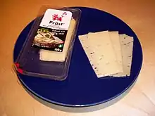 Prästost ("priest cheese") is a Swedish cheese with historical roots in Sweden's one-time custom of paying tithes with agricultural goods including milk.[1] Milk spoils easily so most farms instead produced a small eyed cheese that had its curing process started by mixing in a small batch of fermented curds. This was common practice from the 16th though 19th centuries. Today, this style of cheese once produced in churches across Sweden is factory-made from pasteurized cow's milk.