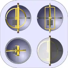 The golden Sun moves around the zodiacal circle, thus showing its position on the ecliptic. The Sun is attached to an arm with a golden hand, and together they show the time in three different ways: