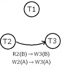 A precedence graph of the schedule D, with 3 transactions. As there is a cycle (of length 2; with two edges) through the committed transactions T1 and T2, this schedule (history) is not Conflict serializable. Notice, that the commit of Transaction 2 does not have any meaning regarding the creation of a precedence graph.