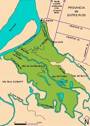 The Predelta National Park (Spanish: Parque Nacional Predelta) is a national park of Argentina, located in south-west of the province of Entre Ríos, 6 km south from Diamante, in the Argentine Mesopotamia, at the beginning of the Paraná River Delta. The park was created on 13 January 1992 under the Law Nº 24.063, with an area 24.58 square kilometres to protect a sample of the Upper Delta of the Paraná, which belongs to the Paraná Delta and Islands Ecoregion.[1][2][3][4] The Predelta is the area where the sediments of the Paraná start forming islands, while the river itself splits into several major arms and many smaller watercourses.