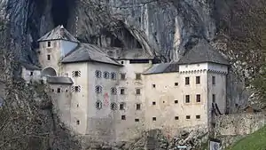 Predjama Castle (Slovene: Predjamski grad or grad Predjama, German: Höhlenburg Lueg, Italian: Castel Lueghi) is a Renaissance castle built within a cave mouth in south-central Slovenia, in the historical region of Inner Carniola. It is located in the village of Predjama, approximately 11 kilometres from the town of Postojna and 9 kilometres from Postojna Cave.[1]