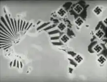 The purpose of the OWI was to use mass communication to appeal to both serving soldiers and later, the American population on the reasons for the war; and so it released Prelude to War to further those goals.[1] The film starts by an explanation of how Americans were brought into the war through heroic motives to protect countries unable to protect themselves. The film expresses the view that America had this duty to righteousness and Christian values throughout history, according to the values and the beliefs set forth by the Founding Fathers.[2][3]