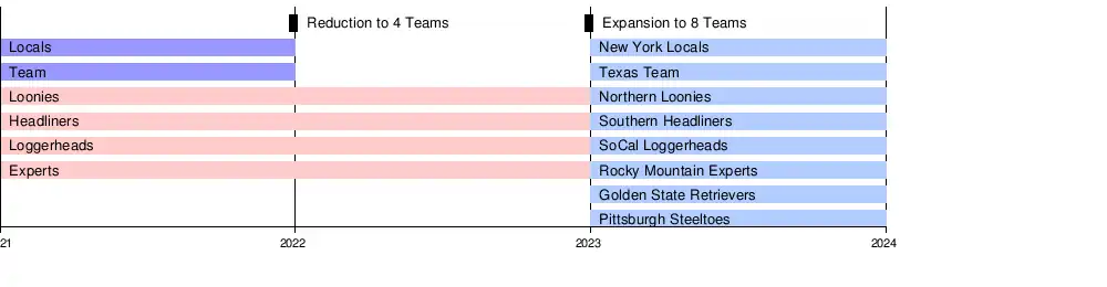 The League initially began with 10 teams (6 men's and 4 women's teams) in 2021.[4] In 2022, the League moved to 8 teams (4 men's and 4 women's teams),[5] before doubling its size to 16 teams (8 men's and 8 women's teams) in 2023.[6]
