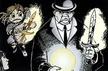 This idea was visually called back to in DC Rebirth when a hand was seen reaching through time to change history.[7] The true identity of the one manipulating this timeline was later revealed to be Doctor Manhattan.[8][9][10]