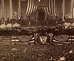Harrison represented Indiana in the United States Senate from 1881 to 1887, but lost his 1886 bid for re-election.[3] In February 1888, Harrison announced his candidacy for the Republican presidential nomination, declaring himself a "living and rejuvenated Republican."[4] He placed fifth on the first ballot at the 1888 Republican convention, with Sherman in the lead; the next few ballots showed little change.[5] The Blaine supporters shifted their support among different candidates, and when they shifted to Harrison, they found a candidate who could attract the votes of many other delegations.[6] Harrison was nominated as the party's presidential candidate on the eighth ballot, by a count of 544 to 108 votes.[7] Levi P. Morton of New York was chosen as his running mate.[8]