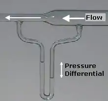 A flow of air through a venturi meter, showing the columns connected in a U-shape (a manometer) and partially filled with water. The meter is "read" as a differential pressure head in centimeters or inches of water.