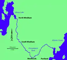 The Presumpscot River (/prɪˈzʌmpskət/)[2] is a 25.8-mile-long (41.5 km)[3] river located in Cumberland County, Maine. It is the main outlet of Sebago Lake. The river provided an early transportation corridor with reliable water power for industrial development of the city of Westbrook and the village of South Windham.[4]