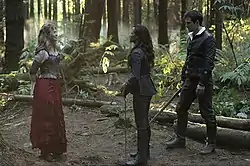 In the past, Regina tells Hook about the crumbled tower that she had come across while training Drizella in magic. He is distraught but is then suddenly reunited with his daughter, Alice, who has found him in the New Enchanted Forest. He warns her to not touch him due to their curse, however, Alice claims that she had found a sorceress who cured them. They move to embrace but it only throws Hook backwards as they realize their curse hasn't actually been broken. Alice runs away in fear and Henry and Ella chase her through a portal to New Wonderland.