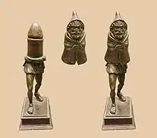 The first extant mention of Priapus is in the eponymous comedy Priapus, written in the 4th century BC by Xenarchus. Originally worshipped by Greek colonists in Lampsacus in Asia Minor, the cult of Priapus spread to mainland Greece and eventually to Italy during the 3rd century BC.[17] Lucian (De saltatione) tells that in Bithynia Priapus was accounted as a warlike god, a rustic tutor to the infant Ares, "who taught him dancing first and war only afterwards," Karl Kerenyi observed.[18] Arnobius is aware of the importance accorded Priapus in this region near the Hellespont.[19] Also, Pausanias notes: