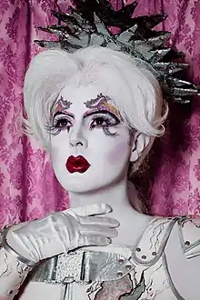 Poppycock "is my mask," says Quale in People Magazine. "Give a man a mask and he will tell you the truth, in the style of Commedia dell'arte."[14] The New York Post noted Poppycock embodies the sensibility of "humor, irony and sarcasm".[15] He wears elaborate costuming and "dresses as if he stepped out of a French Baroque painting (pantaloons, powdered wig and pasty makeup)."[5] The New York Post called him "a towering, powder-faced concoction of glam-rock, synth-pop and light opera wrapped up in flamboyant period costumes."[6] His face is matted with whiteface (or white clown) a symbol of the highest status in the clown hierarchy and the oldest of modern clown archetypes.
