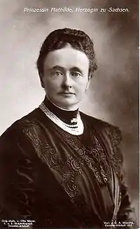 Princess Mathilde of Saxony, Duchess of Saxony (19 March 1863 – 27 March 1933) was the third child and third-eldest daughter of George of Saxony and his wife, Infanta Maria Anna of Portugal. She was an elder sister of the Kingdom of Saxony's last king, Frederick Augustus III of Saxony.