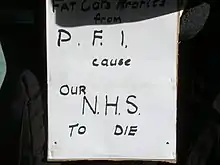 The private finance initiative (PFI) was a United Kingdom government procurement policy aimed at creating "public–private partnerships" (PPPs) where private firms are contracted to complete and manage public projects.[1] Initially launched in 1992 by Prime Minister John Major, and expanded considerably by the Blair government, PFI is part of the wider programme of privatisation and financialisation, and presented as a means for increasing accountability and efficiency for public spending.[2]