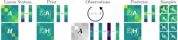 A large class of methods are iterative in nature and collect information about the linear system to be solved via repeated matrix-vector multiplication with the system matrix with different vectors . Such methods can be roughly split into a solution-[8][28] and a matrix-based perspective,[7][9] depending on whether belief is expressed over the solution of the linear system or the (pseudo-)inverse of the matrix . The belief update uses that the inferred object is linked to matrix multiplications or via and . Methods typically assume a Gaussian distribution, due to its closedness under linear observations of the problem. While conceptually different, these two views are computationally equivalent and inherently connected via the right-hand-side through .[27]