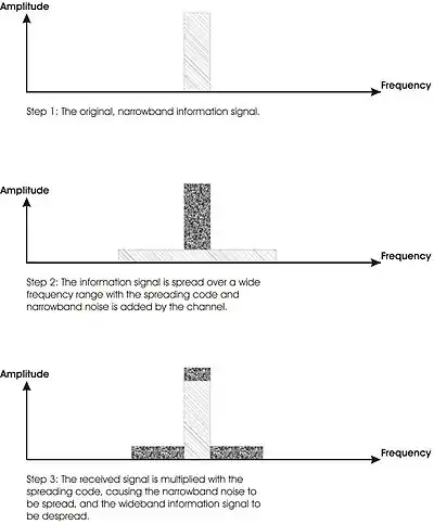 Unlike a conventional communication system, however, a DSSS system does have a certain resistance against narrowband interference, as the interference is not subject to the process gain of the DSSS signal, and hence the signal-to-interference ratio is improved.