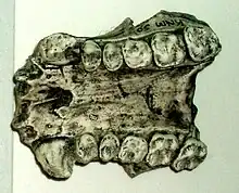 The first specimen, a partial jaw discovered in 1909 by a gold prospector at Koru, near Kisumu in western Kenya, was also the oldest fossil hominoid known until recently, and the first fossil mammal ever found in sub-Saharan Africa. The name, Proconsul, was devised by Arthur Hopwood in 1933 and means "before Consul"; the name of a famous captive chimp in London.[1] At the time Consul was being used as a circus name for performing chimpanzees. The Folies Bergère of 1903 in Paris had a popular performing chimpanzee named Consul, and so did the Belle Vue Zoo in Manchester, England, in 1894. On the latter's death in that year Ben Brierley wrote a commemorative poem wondering where the "Missing Link" between chimpanzees and men was.[2]