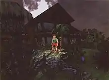 During most of its development period, Project Dream was a role-playing video game (RPG) that focused on a boy named Edson and his pets Dinger the dog and Billy the parrot.[3] In its story, a band of pirates led by Captain Blackeye searched for "floaty", a substance that would allow their ships to fly.[4] Edson got into trouble with the pirates and set off on a journey with his girlfriend to escape them.[5] The Super Nintendo Entertainment System (SNES) version of the game employed an isometric perspective and had a fairy tale theme.[6] Edson used a wooden sword to fight trolls and Dinger performed actions to assist him, such as going ahead and digging holes to find items. Occasionally, a dinosaur would appear and attempt to crush Edson by stepping on him; falling leaves and the virtual camera system shaking warned the player when it was approaching.[3][7]