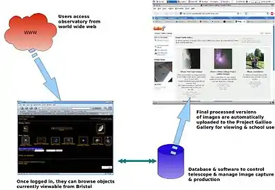 Schools registered via the main Project Galileo website, and then logged in to the telescope to order images, much in the same way as is done with other online school observatories. One important feature of the software being developed for the project is that it comes under the GPL, so other schools or institutions who want to develop similar systems will be able to modify the code rather than having to spend vital educational budgets for proprietary software. The code being used for the project can be found via the #External links.